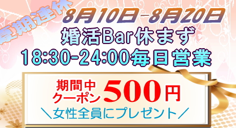 告知!8月10日~8月20日休まず毎日24時まで営業いたします2017.08.092017.8.10-8.20休まず 毎日18:30-24:00まで営業しております期間中ご来店の女性全員に 婚活応援クーポン500円分をプレゼントしたします19時までのお食事+デザートサービスは通常通り実施しております Post Share