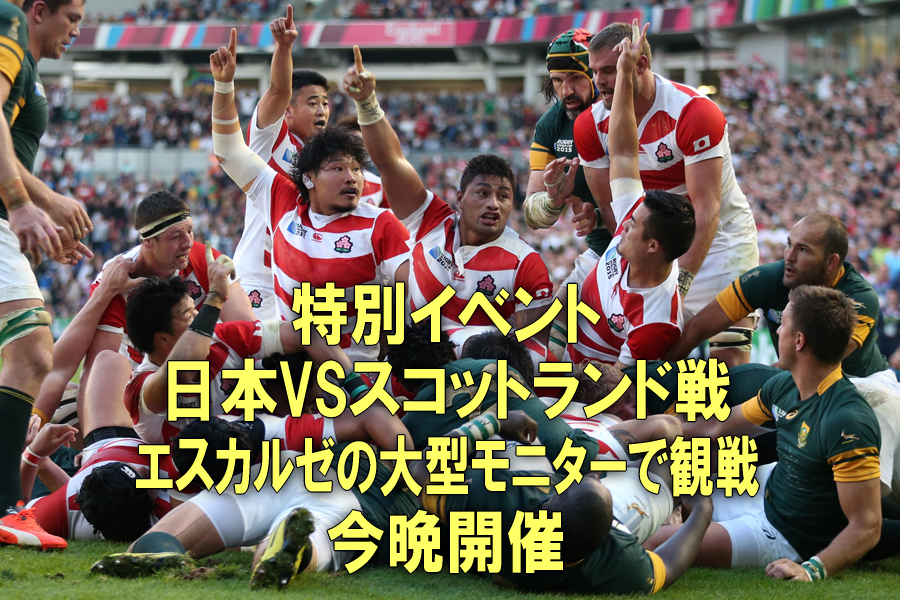 ラグビーワールドカップ、日本vsスコットランド(19:45、日産スタジアム)が予定通りに実施されることとなりましたので、店舗内の大型スクリーンで19:00より中継を行います。