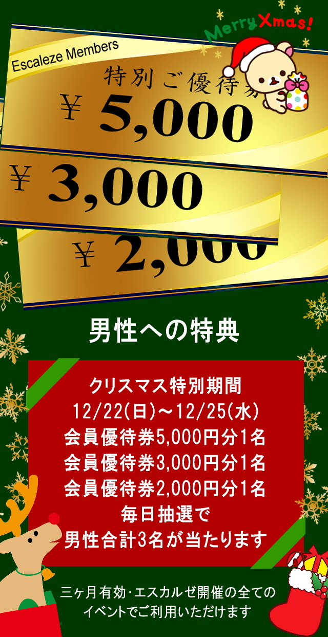 エスカルゼの優待券5,000円分1名、3,000円分1名、2,000円分1名、男性のお客様合計3名が抽選で当たります。