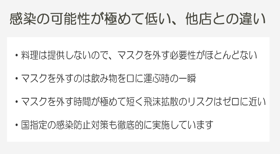 ・相席時におかれましては、ご挨拶やお飲み物を飲まれる以外の会話の際など、マスクのご着用をお願いしております。